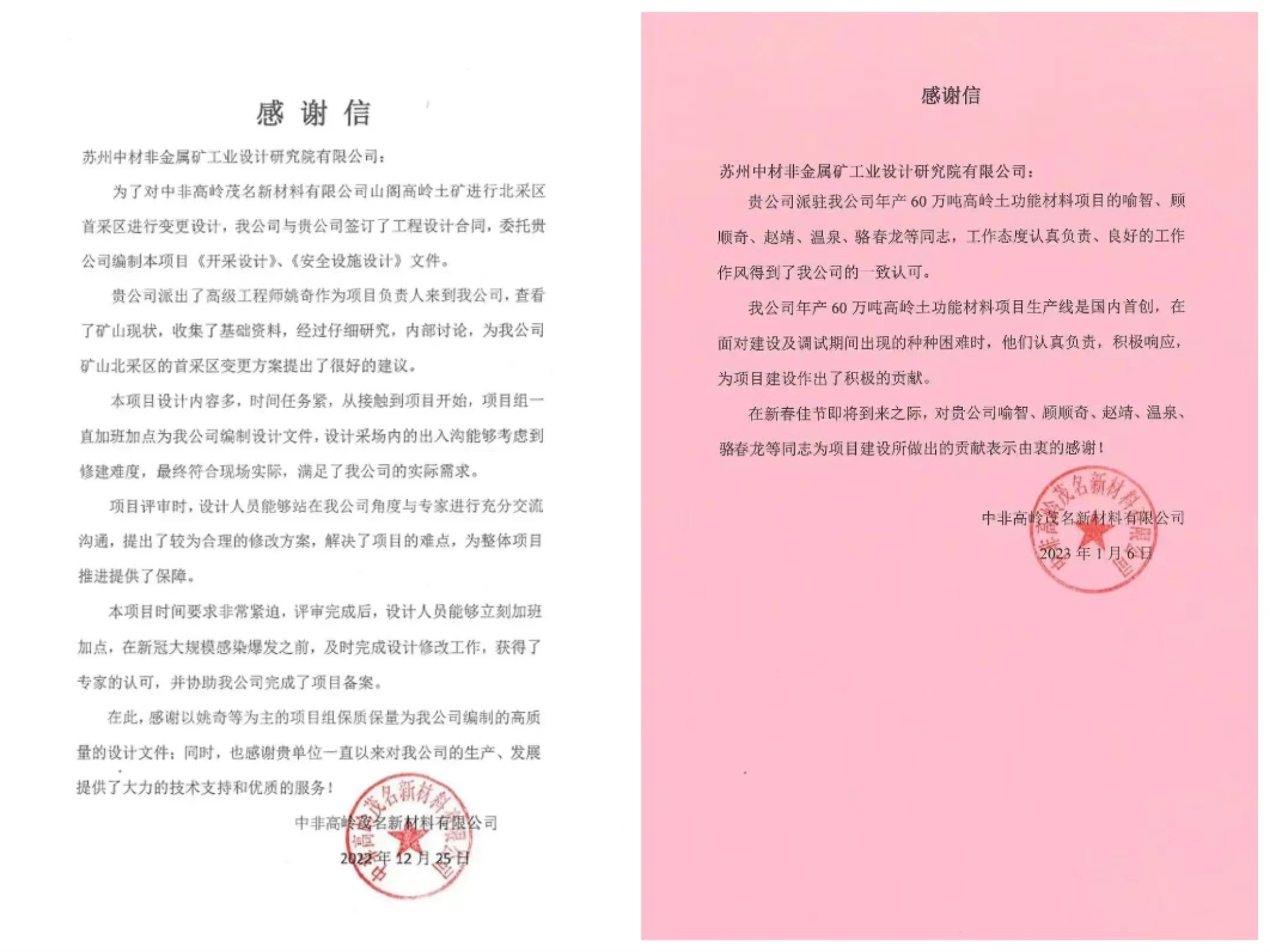 信中表示,2022年,在安徽寶鎂花園吳家礦和小陽山礦一體化開采中,我公司參與礦山工程、礦山加工工程設(shè)計(jì),設(shè)計(jì)人員為了融合兩個(gè)礦山的開拓系統(tǒng),在工期及其緊張的情況下,主動(dòng)與業(yè)主溝通,加班加點(diǎn)優(yōu)化和調(diào)整設(shè)計(jì)方案,使項(xiàng)目順利通過評審,并于近日正式開工。