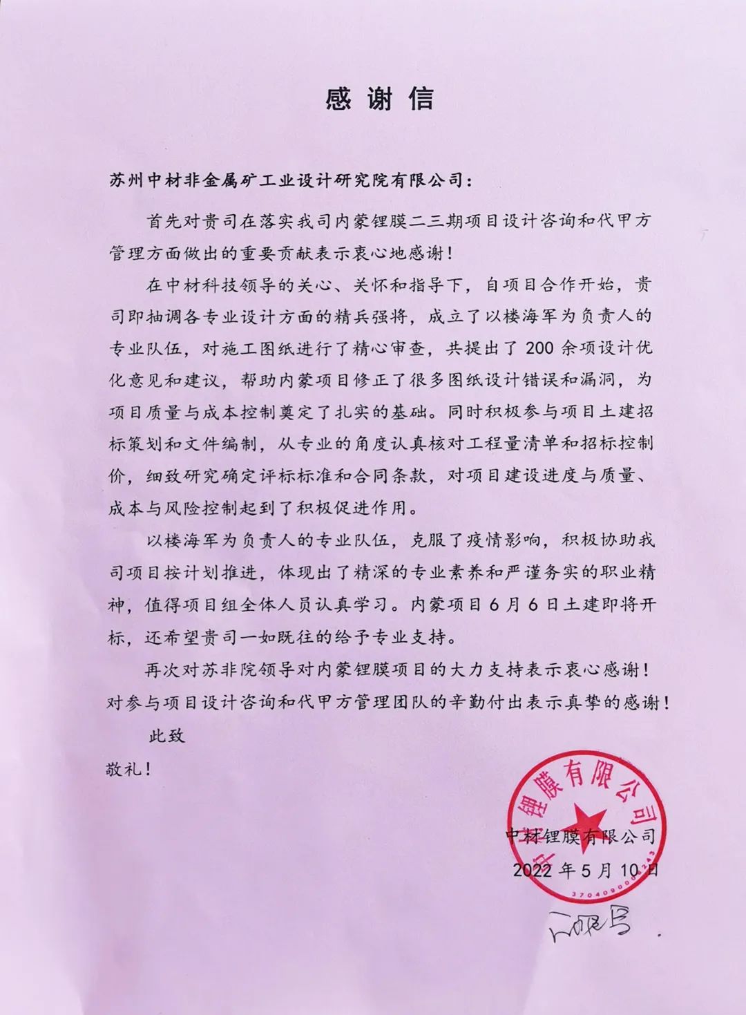 近日,蘇州非礦院收到中材鋰膜有限公司發(fā)來(lái)的感謝信。信中指出:由內(nèi)蒙鋰膜承建的“年產(chǎn)1.6億平方米鋰電......